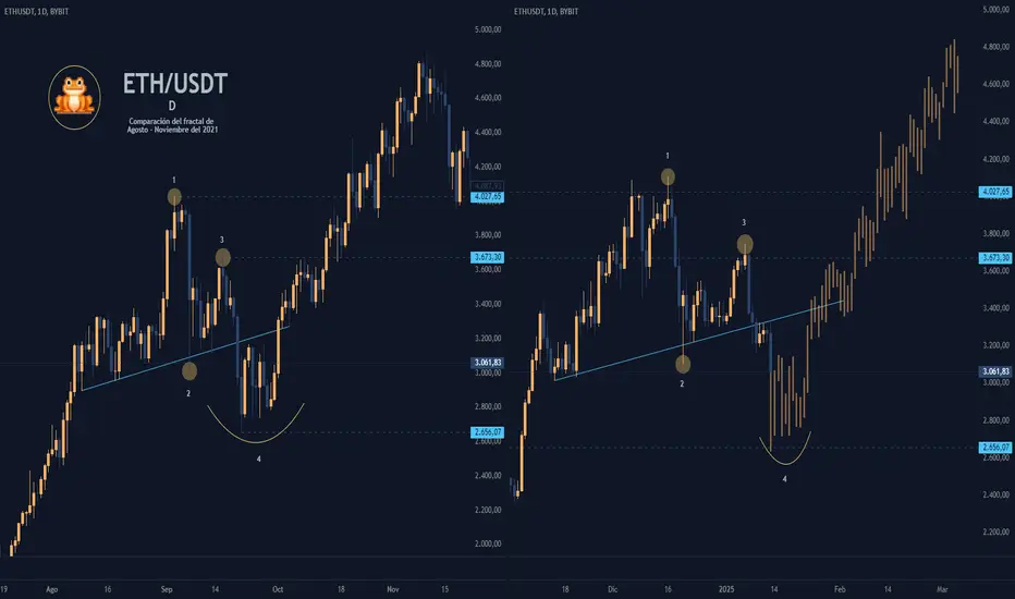ETHUSD que presenta una oportunidad para entender su dinámica actual en comparación con su desempeño en 2021, evidenciando patrones similares que podrían estar gestando un movimiento significativo en el mercado. Ya sabemos que el entorno macroeconómico es completamente diferente, desde una narrativa de