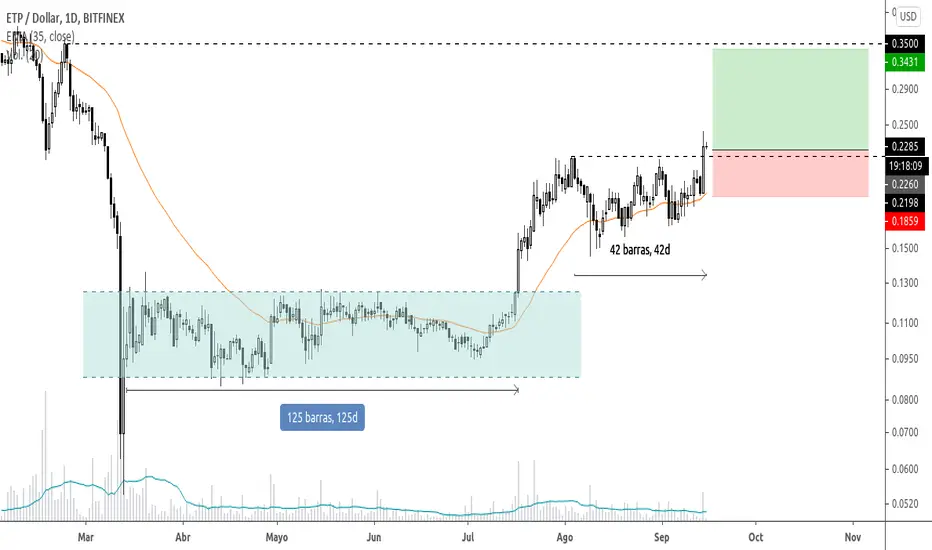 ETP puede dar mucho mas, viendo la gráfica semanal, desde luego. Cada vez que esta moneda entra en modo "berserker" suele hacer entre 400%-600% con cada rally. Pero bueno, siendo "modesto", diré que podría llegar al nivel de los 0.55 USD que es donde se encuentra un importante nivel invertido semanal.