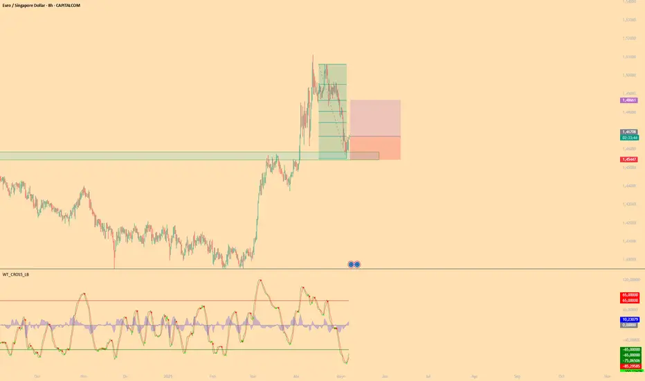 EUR/SGD se encuentra en una zona estratégica, con un nivel de entrada establecido en 1,46708, un área que podría actuar como un soporte clave. La idea de esta operación LARGA se basa en una posible reanudación de la tendencia, aprovechando un movimiento alcista en caso de confirmación del momentum.