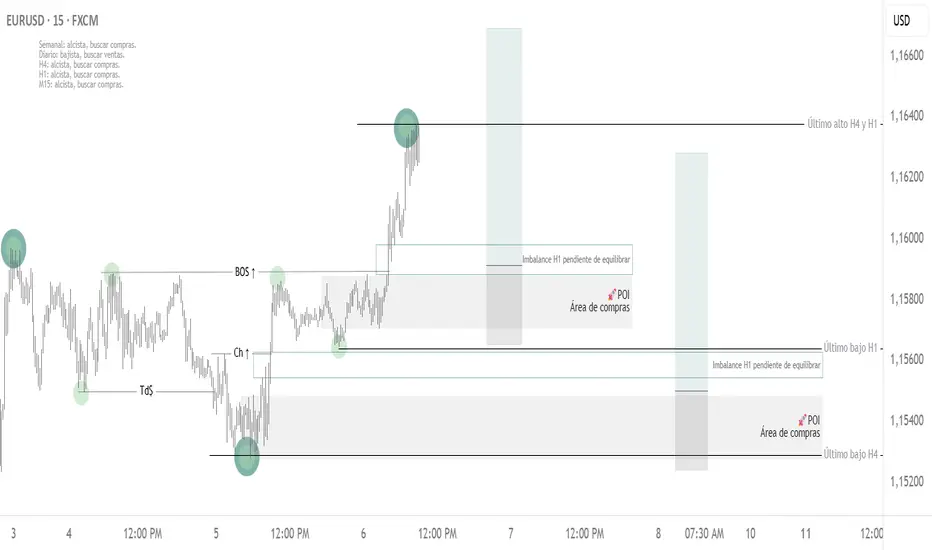 Estructura H4 (punteo verde oscuro) • Altos y bajos H1 (punteo verde claro) • Liquidez ($) • Toma de liquidez (Td$) • Cambio de dirección (Ch) • Continuación de tendencia (BOS) • Punto de interés (POI).