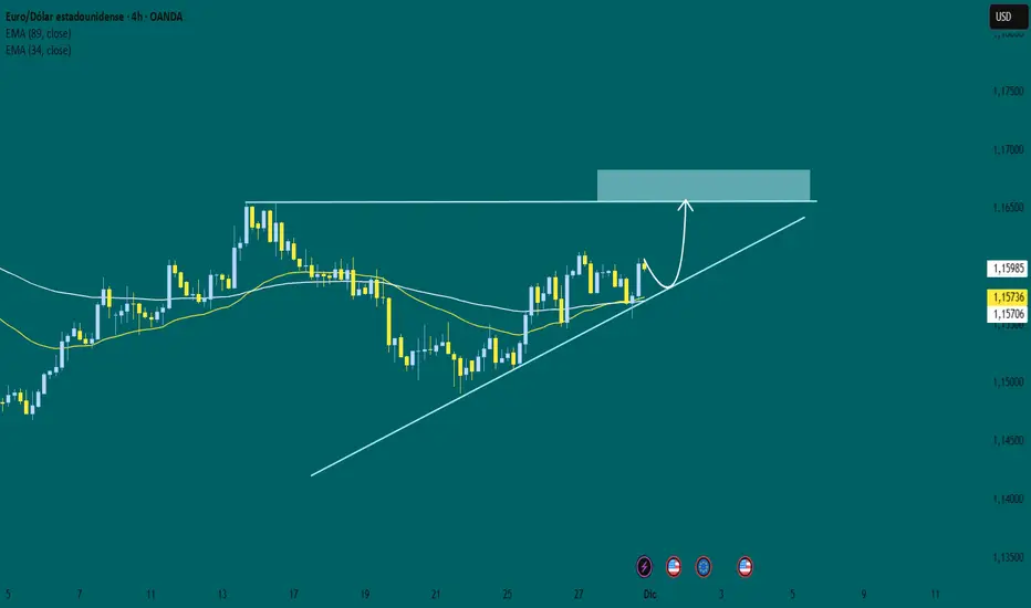 En el gráfico H4, el precio se está moviendo dentro de un canal alcista estable, respaldado por la línea de tendencia y los indicadores EMA34 y EMA89. Cada corrección hacia 1.15700 ofrece una oportunidad de compra, y si este nivel se mantiene, **EUR/USD podría continuar su avance hacia 1.16500, el siguiente objetivo.