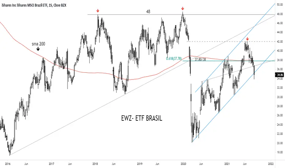 Otra muy dura semana para este etf, el principal del mundo accionario brasileño, que tuvo su cierre semanal más bajo en tres meses lo que incluyo cerrar ligeramente por debajo de la línea inferior del canal ascendente originado durante el año 2020. Por 4ta semana consecutiva este etf queda bien por debajo de la ahora alejada zona de 37.80/38 y en este caso incluyo ir a la zona extremo apuntada ( ver informe previo ) en torno a los 34.95/35.10( en ascenso ), donde se encuentra la línea inferior del canal ascendente que se originara en Marzo 2020, quedando al cierre marginalmente por debajo de esta, primera zona que los Bulls deberían recuperar para acaso poder imaginar que lo peor ha quedado atrás ( no antes ).