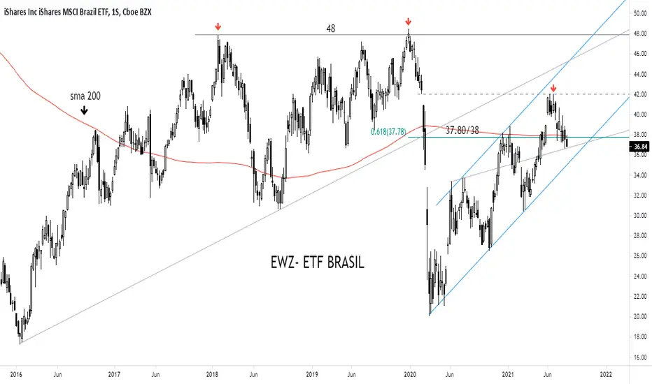 A falta de un día para concluir la semana, este etf sigue estando por debajo de los muy relevantes 37.80/38 ( antiguo soporte, ver adjunto ) que es la zona que los bulls deben recuperar en términos base cierre semanal para acaso ir por mas ( no antes ). Mientras esto no suceda y tal lo observado durante la jornada de hoy, nuevamente se arrimo a lo que es su 1era zona de soporte en esta instancia, los ya citados 36.50/70, valor que fuera arañado la semana anterior y claro esta de no poder aguantar esa zona, ir en búsqueda del soporte extremo, la linea inferior del canal originado en sus mínimos del año 2020, que en el hoy esta en los 34.80/35.10 (en ascenso y base cierre semanal )