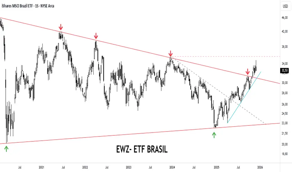 El principal etf de Brasil, EWZ, ha tenido hasta aquí un excelente desarrollo durante este 2025. Sin embargo a pocas horas del cierre de hoy se conoció la noticia de que el ex presidente Jair Bolsonaro ,hoy en prisión, habría manifestado su apoyo a su hijo Flavio para que este sea el candidato de su partido para las próximas elecciones. La noticia sin duda ha descolocado al mercado carioca, el cual cayo pesadamente en el ultimo tramo del día, a tal punto que la semana que venia verde, concluyo con saldo negativo. Y no tan solo eso, si no que el volumen durante el día de hoy en este etf fue el mas grande desde mayo del año 2017. Desde lo estrictamente técnico , este etf había finalmente quebrado un mes atrás su resistencia mas relevante de mediano/largo plazo, me refiero a la linea superior del mega triangulo en el cual estuvo trabajando durante años y es justamente la misma la que emerge hoy, conjuntamente con la linea tendencial ascendente con origen en Abril pasado, como su soporte extremo en caso de continuidad declinante, expresado en terminos base cierre semanal.