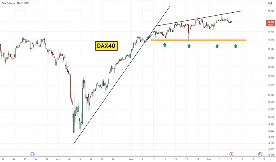 Seguimos con zona lateral de precios y figura de ensanchamiento horizontal en techo de gráficos DAX40.