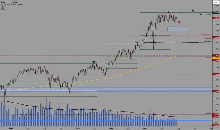 El motor Alemán le llamábamos. Parece mentira que este índice esté donde esté y es que no refleja la realidad alemana NI DE LEJOS. Desde mediados del 2023 que no hay fuerza en volumen, pero esto sigue subiendo. Parece que el precio está reposando y se lo esta tomando con calma en esta corrección mas compleja en tiempo, No cae pero tampoco hace nuevos máximos. Así que mientras no falle en un 62% o fallos proyectivos esto está largo.