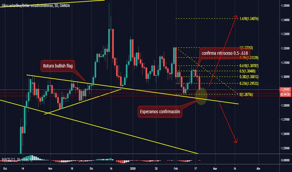 Análisis Gbpusd, se confirma retroceso de fibonacci 0.5 -0.618, la tendencia sigue siendo alcista. veremos confirmación de entrada en el punto de soporte (barra roja inferior)