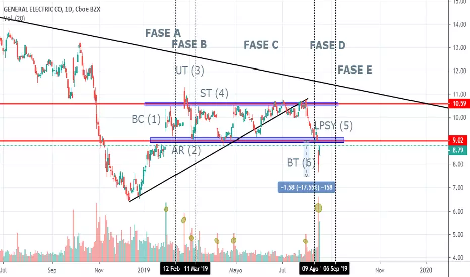 Primeramente, podemos ver que el precio viene de una fase alcista (mark-up) desde inicios de este año. A finales de Enero, el precio hizo un gap de agotamiento que por su volumen y su posterior contexto, podemos considerarlo un Buying Climax (1). Seguidamente se forma el Automatic Rally (2), que su final es bastante confuso, ya que se junta con el Up-Thrust (3), y este es rechazado con una vela bajista con gran volumen, esto nos indica que no hay interés comprador, los profesionales han hecho entrar de nuevo el precio en el canal (no visible de momento). Después el precio marca el Secondary Test (4), lo que hace que podamos trazar ya el trading range (canal lateral). De ahí el precio rebota por dentro del canal, marcando incrementos de volumen en los extremos para mantener el rango, y recordemos que por la ley de causa y efecto, como más tiempo tarde el movimiento a crearse, más potente puede ser. Hace poco el precio ha hecho un Break Througth (6), no sin antes haberse apoyado en el Last Point of Supply (LPSY). El Break Throught tiene un volumen muy alto, a mayores lo hace con un gap de separación, creando así un islote (con el gap de agotamiento ya mencionado anteriormente), figura técnica de giro.