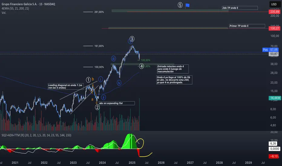 Se ve un claro impulso en leading diagonal por existir overlap, o solapamiento de ondas, luego la onda 3 tiene 5 ondas impulsivas y es valida en mi opinión, actualmente estamos en una onda 4 acumulativa con fundamentals para realizar la onda 5 con los primeros targets en 130 usd y 230 usd por acción, acompañado por una recuperación del credito en argentina y actualmente la salida del cepo e ingreso e inversiones extranjeras.