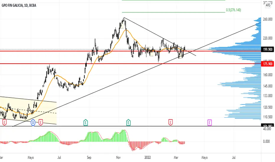 Buenas, esto es lo que estoy viendo en GGAL. Si se mantiene encima de la directriz rota (triangulo roto), podríamos ver el precio en los 276 pesos como primer objetivo y luego los 307 pesos como segundo objetivo. Es clave no perder los 176 pesos. En 170 ubicaría mi STOP.