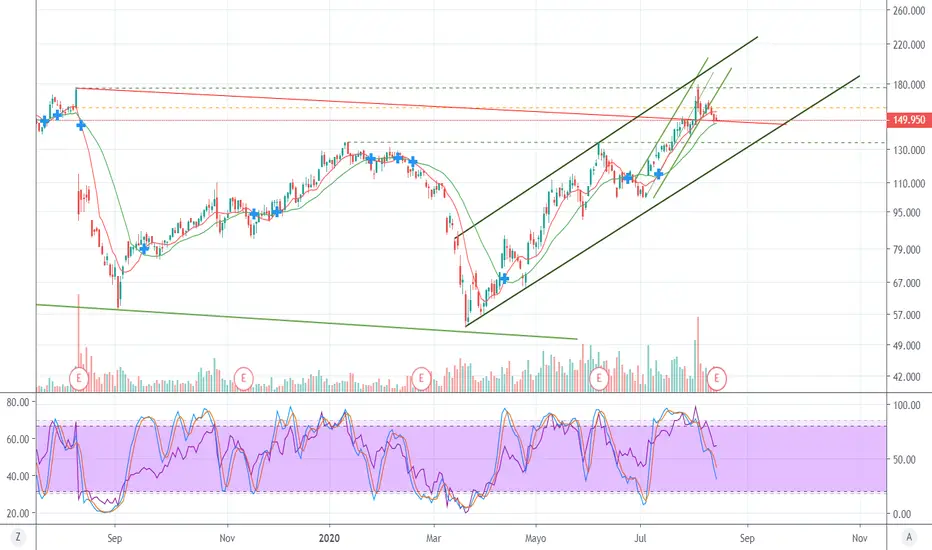 Sus indices dan bajista de corto plazo, pudiendo caer hasta el piso del canal ascendente. Sus esperanzas de seguir alcista y buscar nuevos maximos radican en lograr rebotar en la media de 50, o en la linea de tendencia roja que surgio del maximo anterior y que hoy la respeto a la perfeccion.