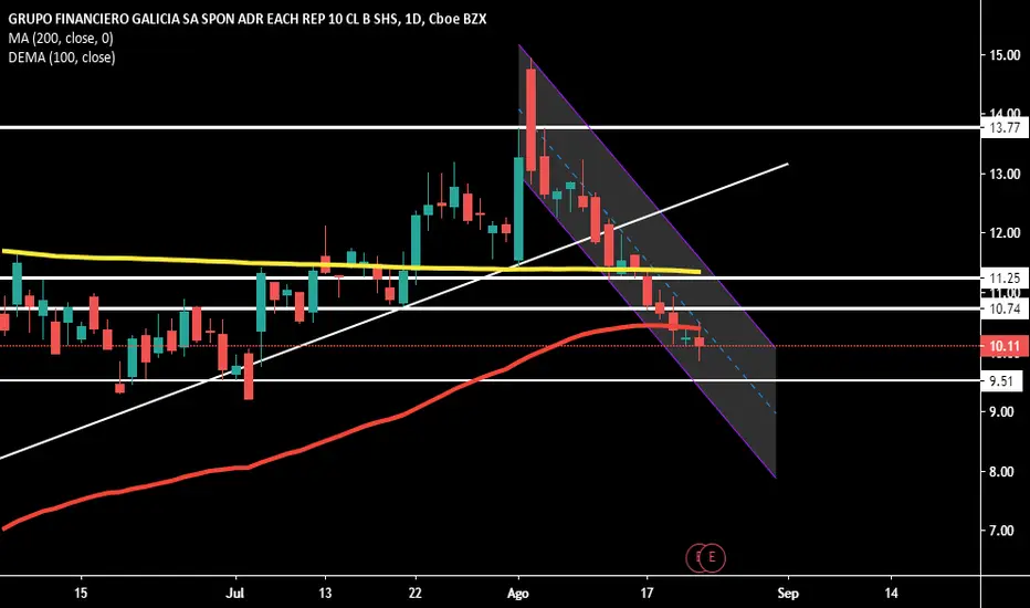 Puede verse como se rompio la tendencia alcista, de manera marcada. Podría estar armando un HCHI si cae a los 9,51 usd y rebota, pero por el momento, veo muy marcado el canal bajista que trace. Posible nuevo soporte, los 9,51, si lo vulnera y cae mas, no veo para nada interesante entrar, y lo veo llegar a valores inferiores de 9 usd. A cuidar el capital y ser cautelosos con nuestra comitente. Dejo una vela de indecisión, tocando con la ema 100 y quedo muy lejos de la media movil de 200 sesiones. No veo nada bueno para entrar.