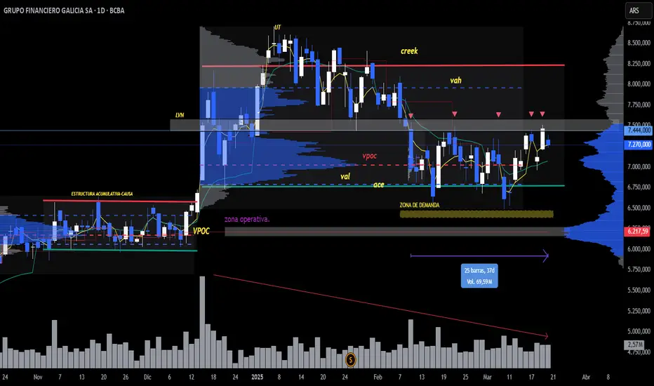7. Escenario Bajista con Reingreso a la Mini-Estructura: Existe la posibilidad de que el precio realice un nuevo UT en el LVN, provocando un reingreso a la mini-estructura y una ruptura del ACE. En este caso, el precio podría dirigirse hacia los 6200 pesos, donde se encuentra el VPOC de la estructura acumulativa. Dicha zona ha funcionado anteriormente como nivel de alta actividad operativa y podría actuar como un imán para el precio.