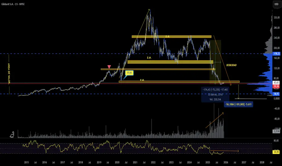 -. GLOBANT está en un proceso de destrucción de valor empresarial y técnica, no en una corrección nor Para inversor de largo plazo, el valor recién sería atractivo si aparece volumen climático o testea la zona 20 USD.