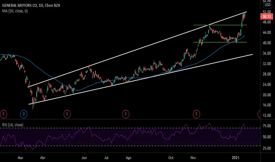 Desde marzo del año anterior la acción de la empresa ha venido en una clara tendencia alcista, y desde noviembre había estado negociándose en un canal lateral (líneas verde) el cual rompió al alza el martes con el anuncio de la nueva camioneta eléctrica. Luego de esto el precio tocó la banda superior del canal alcista y además entró en territorio de sobrecompra, por lo que podríamos ver un retroceso hasta 46,80 o hasta el promedio móvil de 50 días (línea azul) que ha servido como piso en varias ocasiones en los últimos meses.