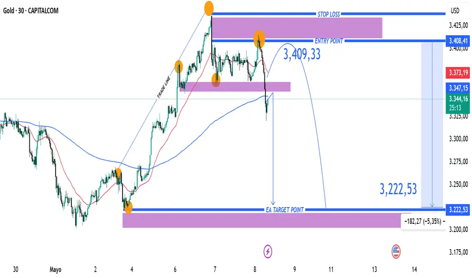 4. Conclusión: El análisis propone una estrategia de venta (short) con una entrada en 3,409.33 USD, buscando un retroceso fuerte hasta 3,222.53 USD. Esta visión sugiere una corrección o tendencia bajista a corto plazo.
