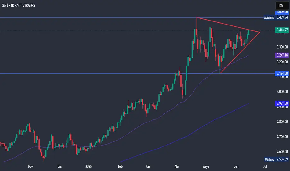 El oro mantiene una tendencia alcista a corto y medio plazo, y de llegar a romper por encima del triángulo simétrico, el metal precioso podría visitar de nuevo la zona de máximos históricos en los 3.500 dólares por onza.