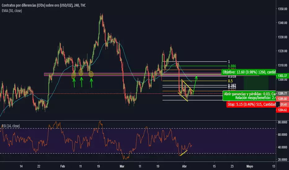 Take Profit alcanzado! Re entrando en la operación recuperamos lo perdido y salimos ganando más del doble de lo que perdimos! Gracias a nuestra gestión de riesgo más de 2 a 1. Sin embargo, yo creería que el oro aún podría subir hasta los 1307, si trazan un fibo más grande desde el impulso bajista que comenzó el 25 de marzo en la vela de las 13h00, verán que el precio de 1307 vendría a caer por los niveles entre el 61.8 y 66.6. Después de eso le vería viable que el precio busque su siguiente impulso fuerte a la baja. Pero eso quedará para posterior análisis! Sin embargo este trade de compra salió más que bien. Si el stop te sacó la primera fue con poca pérdida ya que cuando tocas el TP sales con más del doble de ganancia respecto de lo que perdiste la primera vez! Esa es la única manera de tener la rentabilidad y consistencia asegurada a lo largo del tiempo en el trading!!Operación cerrada: objetivo alcanzado
