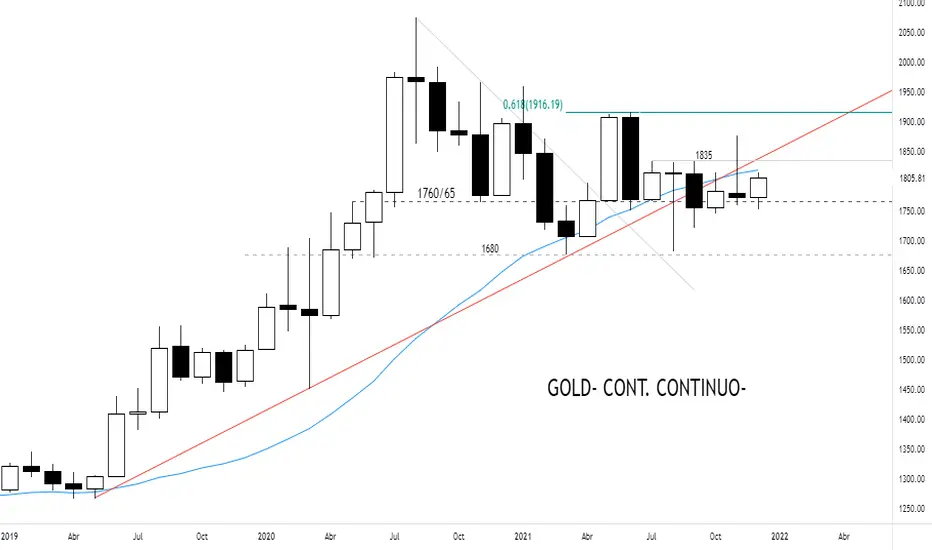 Nuevo intento del oro por superar lo que en el hoy representa su principal resistencia que es un combo en donde esta por un lado la tendencial ascendente, en términos base cierre mensual, cuyo origen data de mediados del año 2019 y la denominada media móvil divisoria, una tanto mas abajo que la anterior. tal puede apreciarse en la figura adjunta. Su gran soporte sigue estando en los 1760/5, zona que fuera testeada con éxito durante el mes aun en curso.
