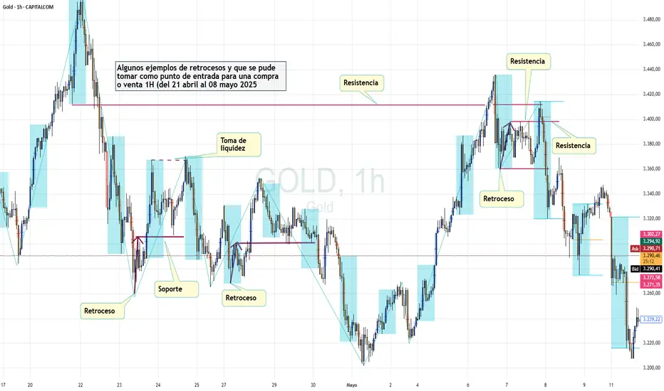 En el gráfico siguiente se está marcando la estructura mayor pero teniendo énfasis en los retrocesos (solo algunos ejemplos) de la temporalidad de 1H, de esta forma podremos aprovechar una oportunidad de compra o de venta. El color celeste es la sesión de Asia y en este caso se puede operar en la sesión de NY