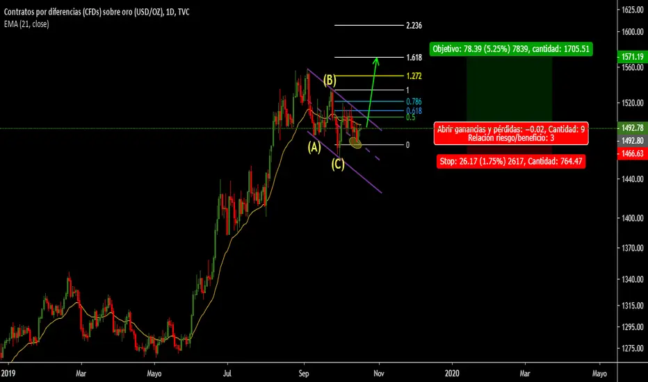 Después de una linda corrección ABC en zigzag que dio justo en el nivel de extensión 1, busco el siguiente movimiento alcista para el oro. Precio se ha metido por encima de la línea media del canal paralelo. Si ya se ha hecho la onda 1-2 que da en un retro del 78.6 entonces busco un objetivo para siguiente movimiento al nivel de extensión 1.618. Honestamente esperaba una corrección MUCHO más fuerte en el oro por eso me voy en compras.