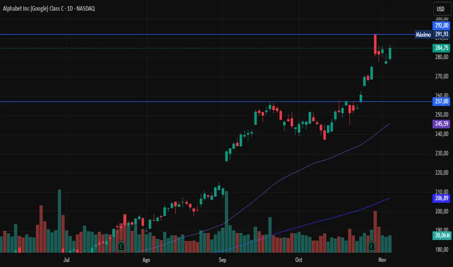 La acción de Alphabet (GOOGL), la empresa matriz de Google, registró un nuevo máximo histórico durante la semana pasada, alrededor del 292,00 y aunque retrocedió levemente a la baja desde ese nivel, todavía mantiene una tendencia alcista a corto y medio plazo.