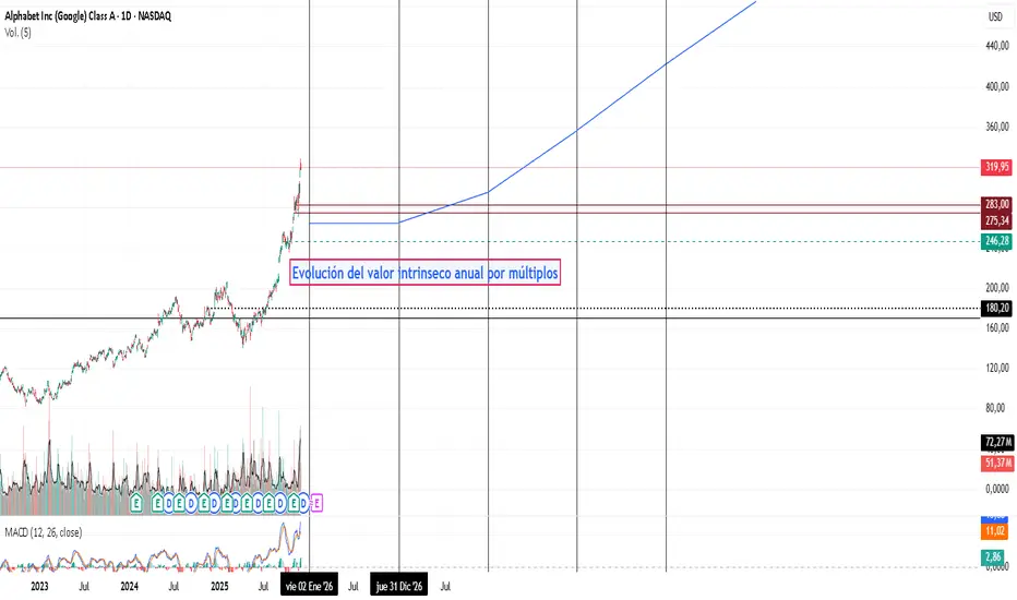 Hasta los anuncios de Meta de compra de chips de Google este es el valor intrínseco por múltiplos anualizado de Google. El precio sigue al valor en su recorrido. ¿Ha llegado la hora de vender o seguimos dentro? ¿Qué opina?