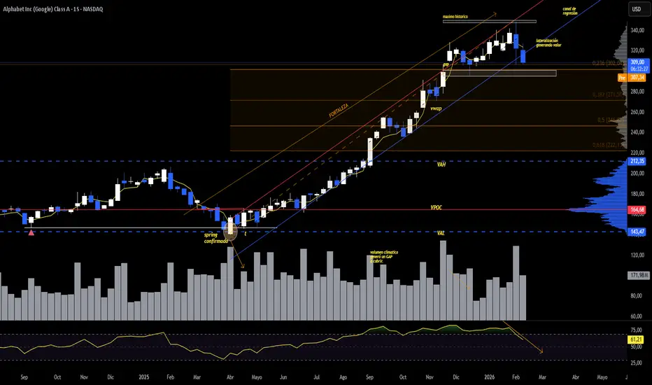 El gráfico semanal de Alphabet (GOOGL) no deja lugar a dudas: estamos en pleno dominio institucional. Tras validar un Spring impecable que limpió el mercado el año pasado, el activo ha entrado en una fase de Markup respaldada por un canal de regresión perfecto. La actual 'lateralización generando valor' sobre los $300 es la pausa necesaria para que el RSI tome aire antes del próximo impulso. Con el VPOC quedando cada vez más lejos en la base, la pregunta no es si va a caer, sino cuánto tiempo le queda a la demanda para atacar los nuevos máximos históricos. ¡Paciencia y tendencia¡