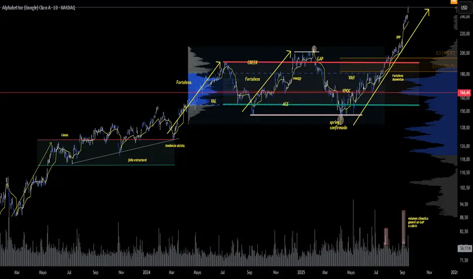 GOOGL se encuentra en pleno rally alcista, post ruptura del creek y validación del spring. El impulso muestra momentum creciente, aunque se empieza a vislumbrar una posible corrección técnica lógica por extensión.