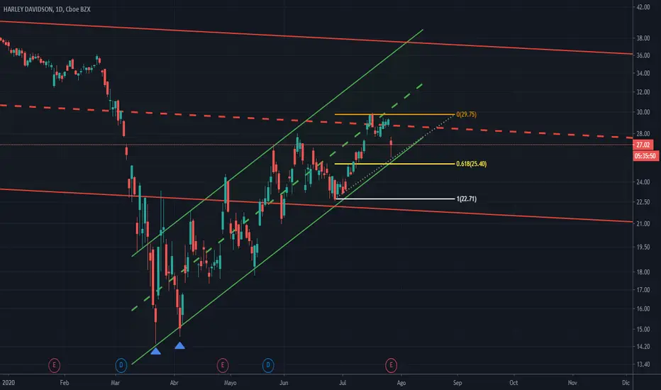 HARLEY DAVIDSON (HOG).. no aguanta la mediana y retrocede llegando a 61,8 de fibo. Esperamos y seguimos viendo si puede marcar su nuevo canal alcista... QUE SEGURAMENTE ES IMPOSIBLE, YA QUE SON AÑOS MUY DIFÍCILES LOS QUE VIENE TENIENDO HARLEY.