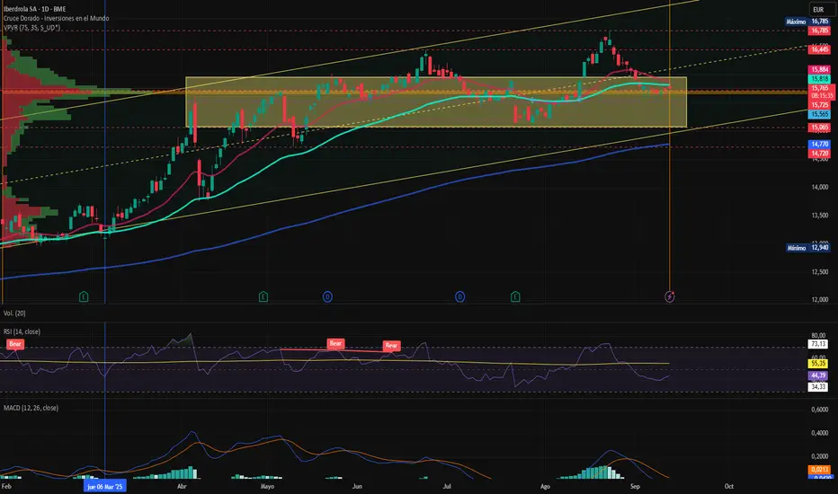 En el plano bursátil, las acciones de Iberdrola cotizan en torno a los 15,73 euros, con una ligera corrección respecto a los máximos anuales. El gráfico diario muestra una tendencia alcista de fondo, apoyada en la directriz iniciada en octubre de 2024. El soporte clave se sitúa en los 14.76 euros, mientras que la resistencia inmediata está en los máximos del año alcanzados el 22 de agosto. Actualmente la cotización desde inicios de abril se ha desarrollado en una zona de consolidación entre los 14.72 y los máximos actuales de 16,785 euros. Siendo un rango estrecho entre los 15.80 y los 16.03 el movimiento más visitado centrando el punto de control (POC) entorno a la cotización actual. El desplazamiento del inicio de sesión se ha dado con un gap alcista recuperando el precio a los 15.780 euros, ligeramente por encima del cierre anterior. Esta señal de apoyo en la media de 100 puede estar indicando un giro al alza a pesar de unos indicadores técnicos mixtos en el corto plazo. RSI en 45,59% nos señala ligera sobreventa, MACD entrando en territorio negativo con un histograma bajista en contracción podría señalar una indecisión en el mercado sobre este movimiento. Por el momento la media de 50 y de 100 sostienen su posición alcista, y podría verse una recuperación del precio en lo que queda de semana. Por otra parte el indicador ActivTrades Europe Market Pulse nos indica el mercado europeo se haya en zona neutra – mixta reduciendo su volumen con tendencia hacia el Risk Off. Una ruptura al alza podría proyectar al valor hacia la zona psicológica de 17,50 euros, mientras que una pérdida de los 16 euros abriría la puerta a caídas hacia la zona de soporte fuerte.