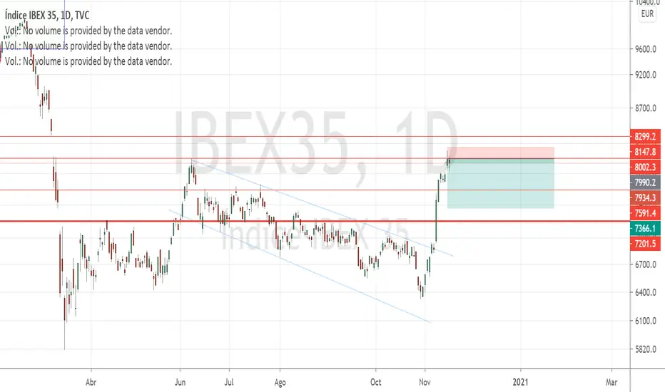 El IBEX ha subido con las buenas noticias pero es de esperar que se tome un tiempo de relax llegados a estos niveles. Aunque es posible que siga con la tendencia alcista, en unas semanas podríamos vivir una bajada hasta la zona de soporte de los 7.150. Esto nos da un riesgo del 2% y un beneficio del 8%. Se puede obtener una rentabilidad de 2 veces el riesgo si salimos en la primera línea roja (soporte).