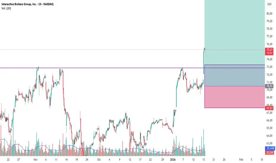 En gráfico horario de IBKR observamos una potente ruptura con volumen y vela de confirmación de un nivel de resistencia.