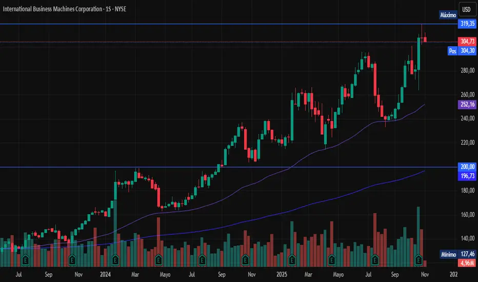 El precio de IBM acelera su impulso alcista desde la zona del 265,00 hasta registrar un nuevo máximo histórico en el 319,35, en donde se frena un poco.