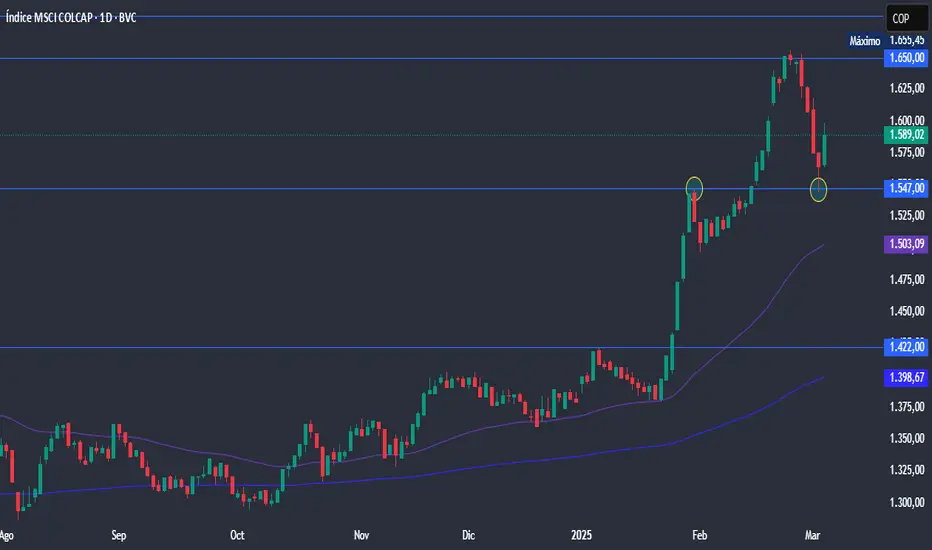 El Colcap de Colombia venía retrocediendo a la baja desde los máximos en los 1.650 puntos, nivel que no visitaba desde hace más de cinco años, y cae hasta los 1.547 puntos, nivel de soporte/ resistencia.