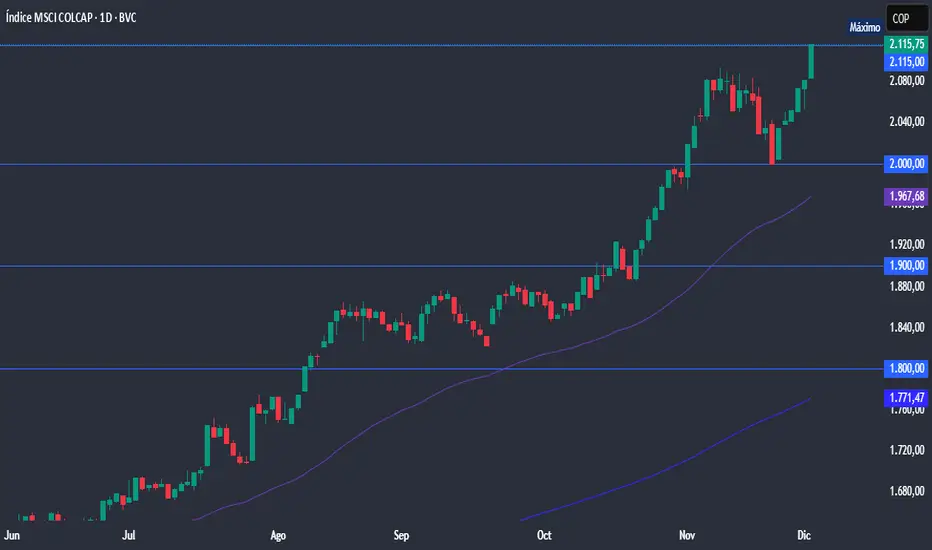 El índice del Colcap completó seis sesiones consecutivas cerrando en positivo y registra un nuevo máximo histórico en los 2.115 puntos, impulsado principalmente por las acciones del Grupo Cibest (Bancolombia) y la empresa de combustibles Terpel.