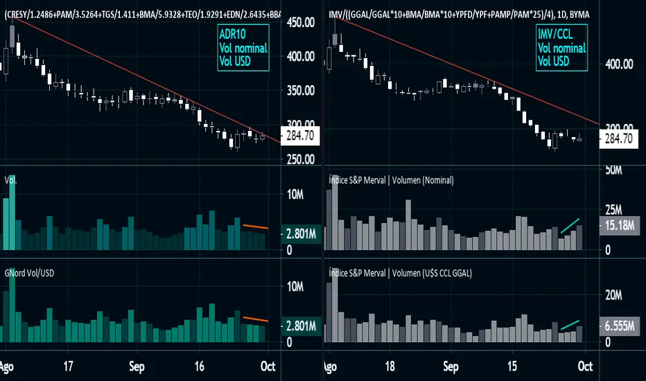 Desde esa plantilla les quedan disponibles todos los indicadores de volumen incluidos en la idea. El primero es volumen nominal con 4 niveles de color según niveles medios; el 2º es volumen * precio, para graficar la cantidad de dólares operados por rueda; el 3º, escrito por marketmakerBA, es exclusivo para el Merval y se puede seleccionar en nominal, en ARS y en USD.
