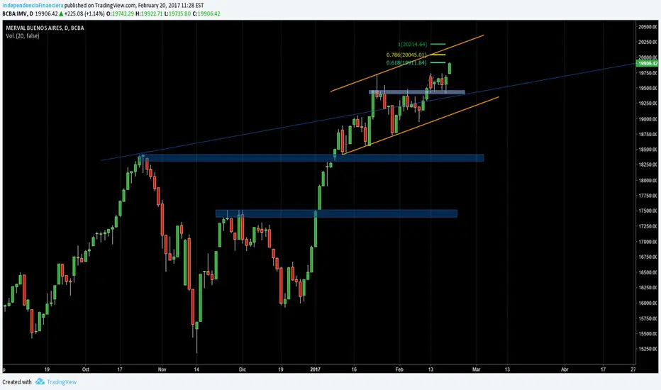 Sin mercado en USA el merval se pone la camiseta y saca un velon verde con salida fuerte, prima el optimismo y vamos por los 20k y luego techo de canal coincidente con pequeña proyección de fibo del último swing alcista. 20.2k El target, pero la verdad va a estar en los 20k. Máximos historicos para nuestro mervalucho nuevamente.
