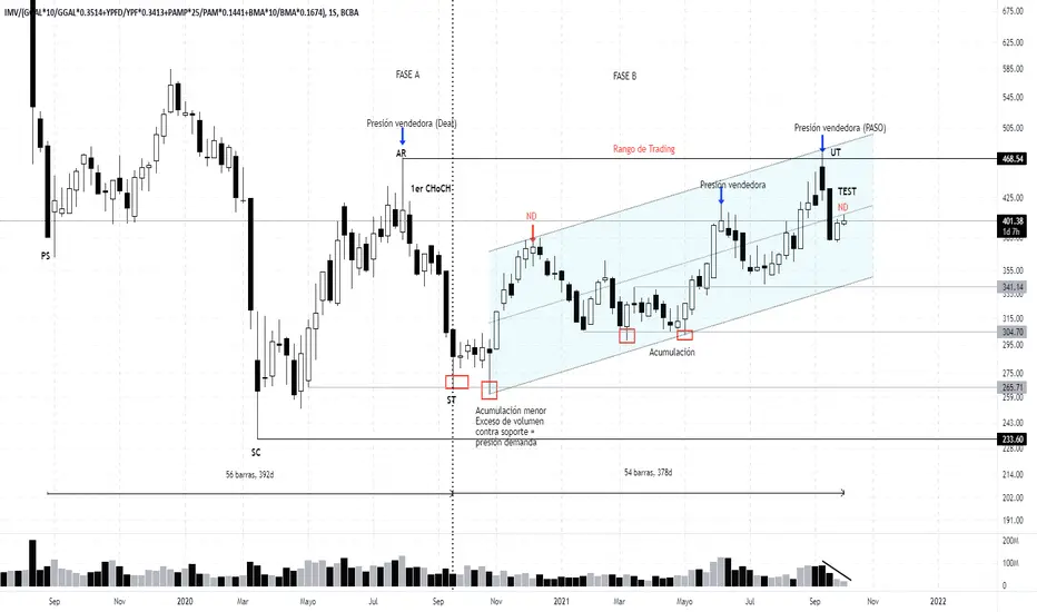 Un año en Fase B. Para resumir en Fase A se produce el 1er cambio de carácter, paso de tendencia bajista a rango lateral. Fase B, lucha oferta y demanda. Fase C, ganador, con o sin Shake. Fase D, fortaleza de la demanda dentro del rango y Fase E quiebre del TR y confirmación de proceso de acumulación.