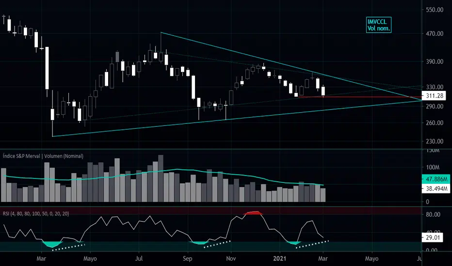 Mirando al Merval junto al volumen nominal (gran aporte de es.tradingview.com/u/marketmakerBA ) se llega a ver que, aunque las dos últimas velas se ven muy sólidas, el volumen descendió... algo que interpreto de un modo positivo al comparar este comportamiento con el de los pisos previos dentro de ese triángulo con un año de formación, y el RSI pareciera sugerir algo de esto. Posible "doble piso" contra la línea roja y eso también sería bueno... aunque si es perforada los 280 contra la base del triángulo no serían tan graves.