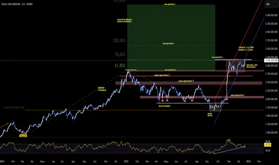 El precio del Merval continúa respetando con precisión quirúrgica la estructura planteada en la hoja de ruta. La lectura actual se puede resumir en tres grandes ejes: confluencias, lateralización constructiva (generación de valor) y la posible re-entrada al canal de regresión alcista.