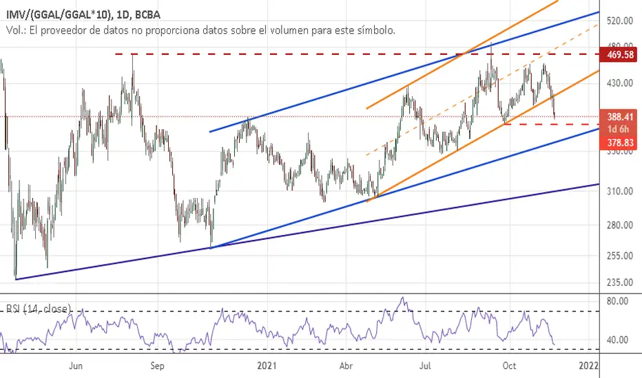 Doble techo en 455 y a partir de allí comienza a corregir. Ya quebró el canal alcista de menor plazo en el cual venía operando y el próximo soporte a monitorear estaría en 380. A partir de allí vendría la línea de tendencia que pasaría por 365.