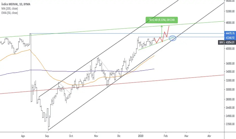 La base del triángulo está dada por la directriz alcista que une los mínimos ascendentes y el techo por la resistencia en los 43.368 puntos.