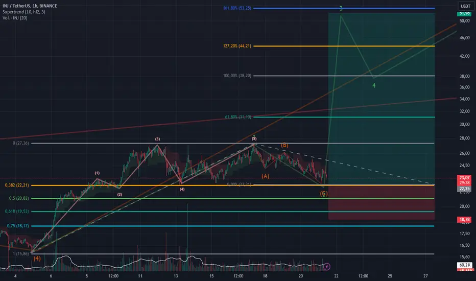 Según mi análisis estamos en la onda 5 de grado mayor, en la que dentro de esa estamos empezando la onda 5, y en la que dentro de esa diría que acabará la onda 2 sobre los 22.25, ya que la onda C tiene que cerrar por debajo de la onda 4 interior anterior, que encima coincide con el nivel 0,382 de retroceso de Fibonacci, por lo que sobre esa zona (los 22.25) diría que terminará la onda 2 para dar comienzo a una onda 3, que podría llegar hasta los 50.