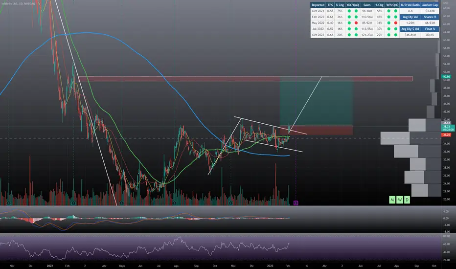 Ahora mismo está apoyando en la directriz de todo ese canal bajista sin volumen después de romper toda esa acumulación con bastante volumen, en teoría el objetivo total de esta formación sería llegar hasta los 51 dando una relación R/B de 1/5.38.