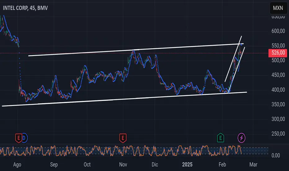 Cómo se puede apreciar en la gráfica, la tendencia principal de las acciones de Intel ha sido una mas o menos lateral desde 2024, también, se ha tenido una muy fuerte tendencia alcista desde hace unas semanas. Esta tendencia alcista ya ha durado algún tiempo y es normal preguntarse que tanto tiempo durará la racha alcista para Intel. Mi análisis sugiere que podríamos estarnos enfrentando ante una posible caída en el precio de las acciones de intel con mínimos en los $400.00 MXN y con posibilidad de que aún suba de precio hasta los $560 MXN aproximadamente.