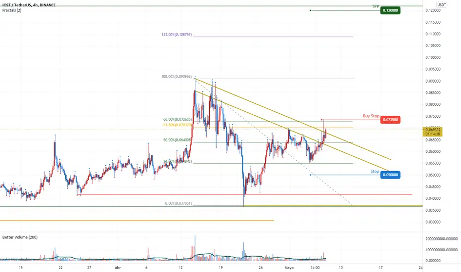 IOSTUSDT en futuros de Binance usando la Metodología TRART. La orden Buy Stop la situamos en los 0,0735. El stop en los 0,05 y haremos un cierre parcial en los 0,12.