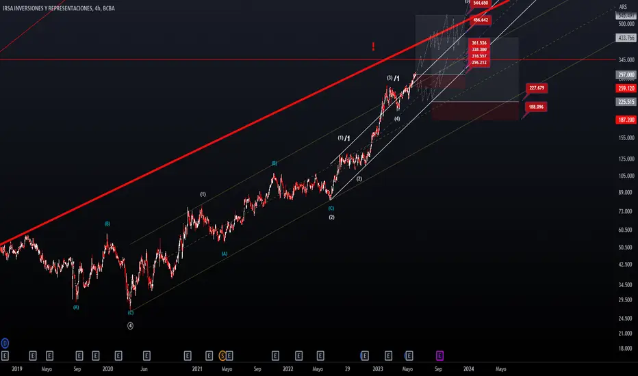 IRSA 4H esta es mi especulación y el plan que voy a seguir para tomar posición en IRSA, viene mostrando un gran comportamiento alcista, de momento superando dos canales por la parte superior uno de grado intermedio (amarillo) y otro de grado menor (blanco) de grado mayor especulo estar en una onda 5TA, por eso proyecto la continuidad alcista, mas arriba tenemos una constante de suma importancia (roja) esta linea de tendencia marca el desarrollo de máxima aceleración histórico del precio, por lo cual montarse por encima de la misma seria un indicio de fortaleza alcista importante, fallando la primer caja operativa, se habilita la 2da entrada, a medida que se valla desarrollando iré actualizando la idea.