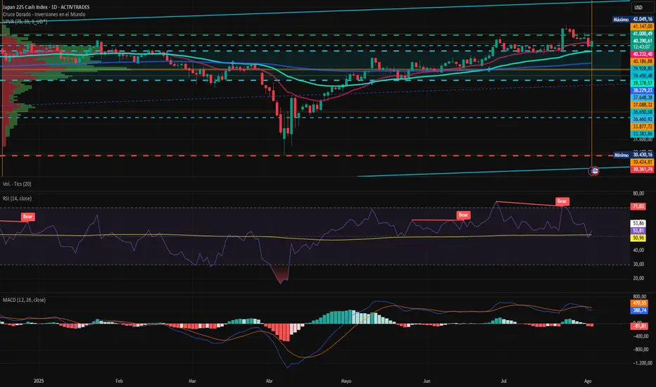 En el plano técnico, el índice se aproxima a niveles clave con indicadores mixtos. Si bien la tendencia de fondo continúa siendo positiva, el mercado podría enfrentar fases de consolidación o corrección en el corto plazo, especialmente si se mantienen las presiones sobre el yen y se confirma una posible intervención del Banco de Japón.