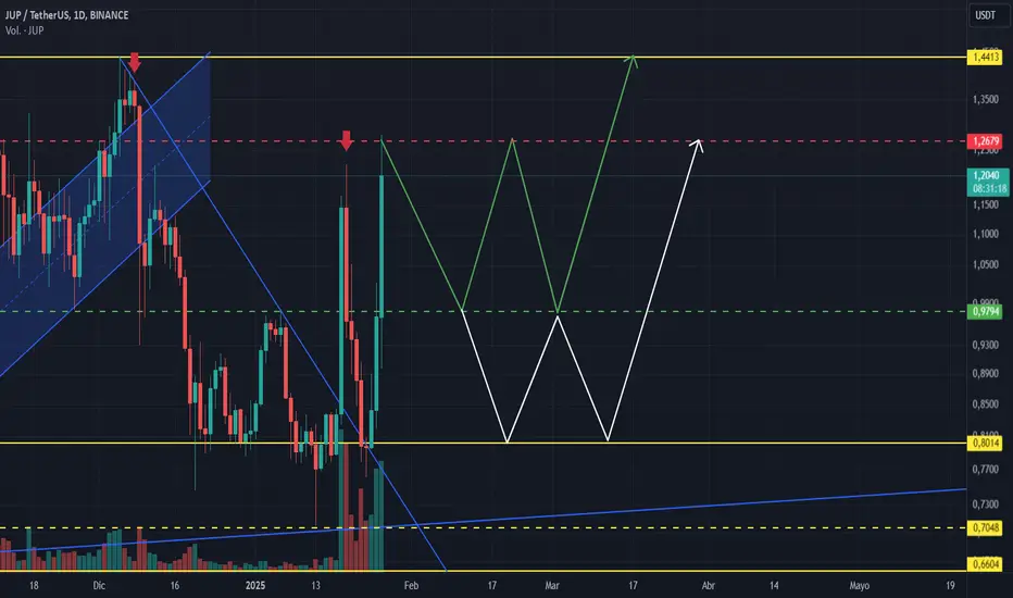 Consolidación y avance: Si el volumen de compra se mantiene, es posible que JUP haga un leve retroceso hacia los nuevos soportes para luego tomar impulso y buscar los máximos anteriores.